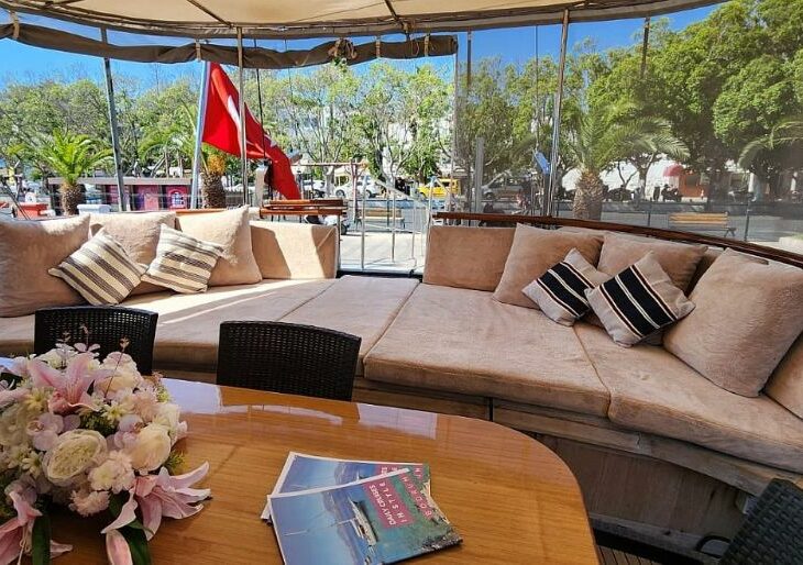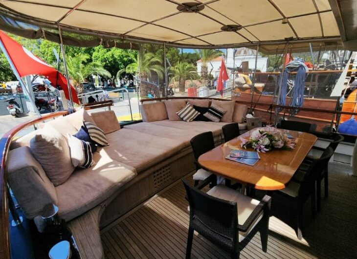 LCD TV in master cabin, Sunbathing mattrasses, Front deck seating area, Outdoor dining table, Dining table in saloon, Music system in saloon, Separate crew cabin.