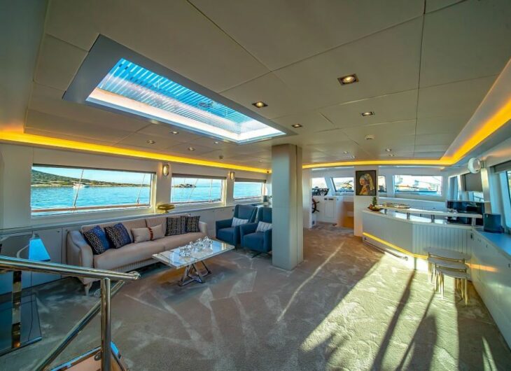 Flybridge, Minibar in Master Cabin, Sunbathing mattrasses, Front deck seating area, Outdoor dining table, Dining table in saloon, Music system in saloon, Separate crew cabin.