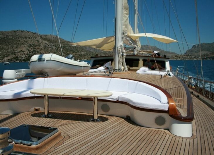 Sunbathing mattrasses, Outdoor dining table, Dining table in saloon, Separate crew cabin, Crew area.