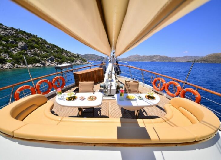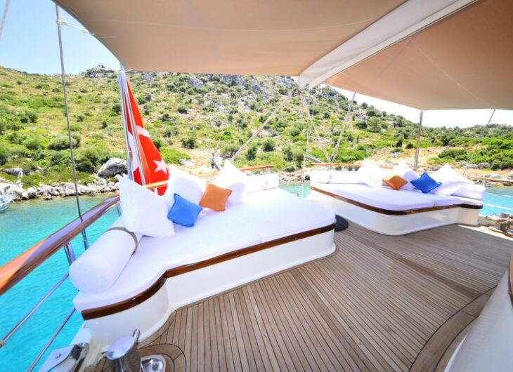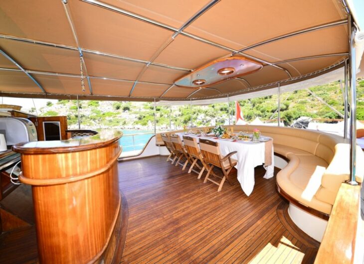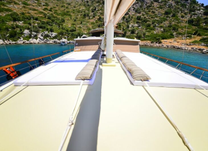 Sunbathing mattrasses, Front deck seating area, Outdoor dining table, Dining table in saloon, Music system in saloon, Separate crew cabin.