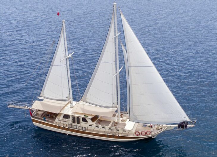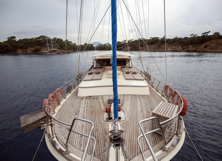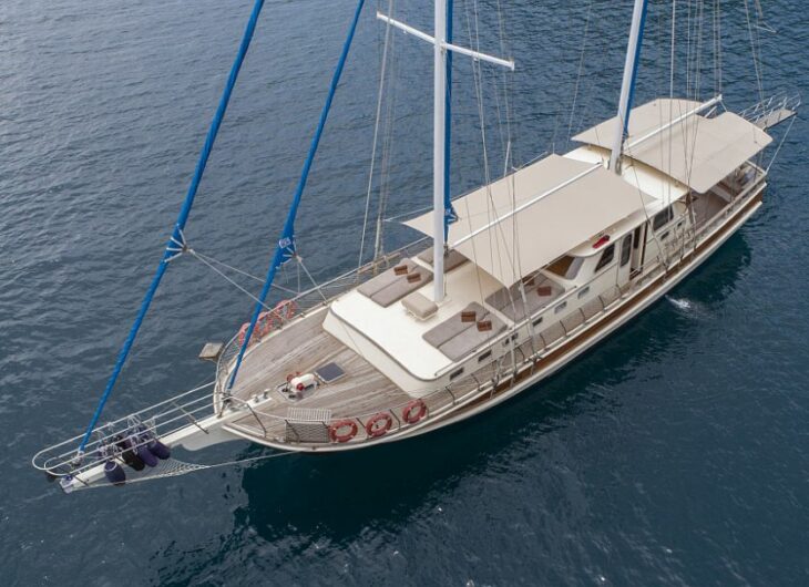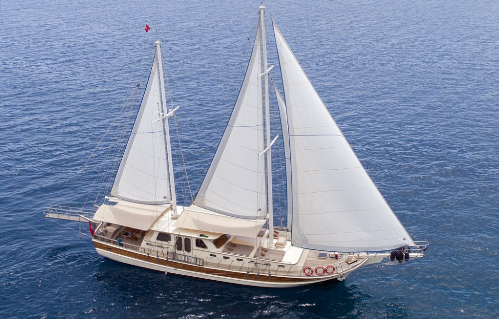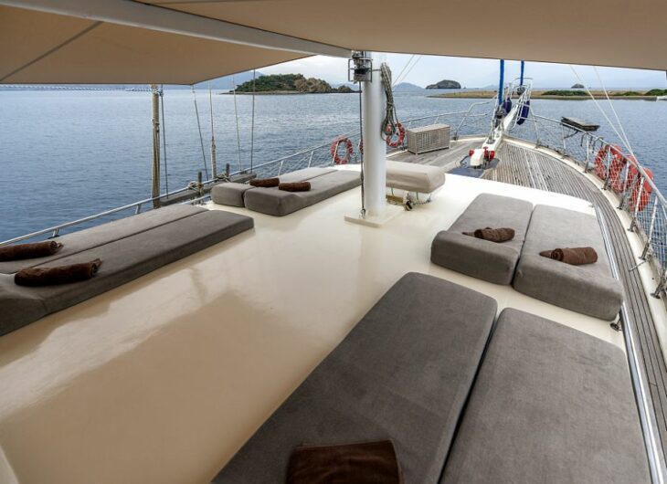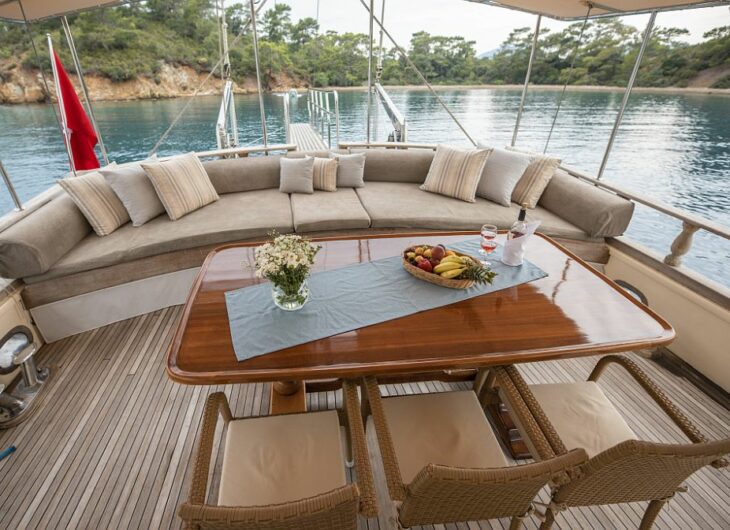 Sunbathing mattrasses, Outdoor dining table, Music system in saloon, Separate crew cabin.
