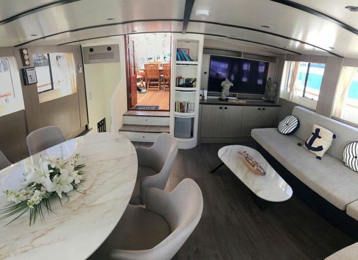 Sunbathing mattrasses, Front deck seating area, Outdoor dining table, Dining table in saloon, Seating area in salon, Separate crew cabin.