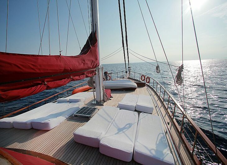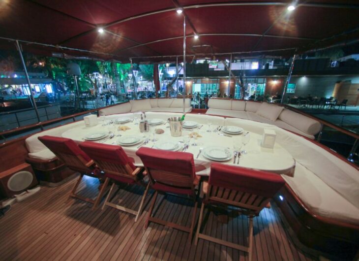 Sunbathing mattrasses, Outdoor dining table, Dining table in saloon, Separate crew cabin.