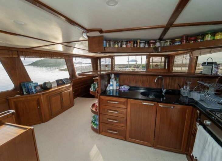 Flybridge, Sunbathing mattrasses, Outdoor dining table, Seating area in salon, Separate crew cabin.