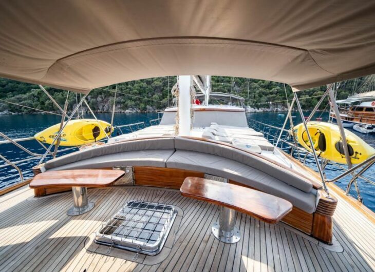 Sunbathing mattrasses, Outdoor dining table, Dining table in saloon, Separate crew cabin.