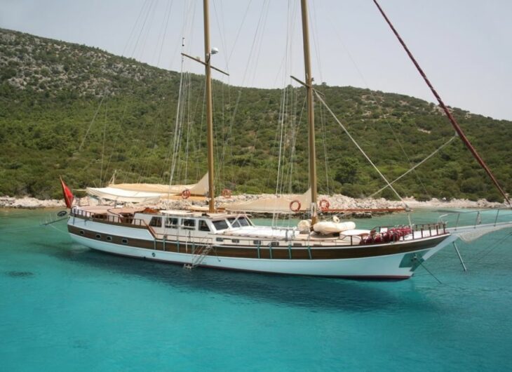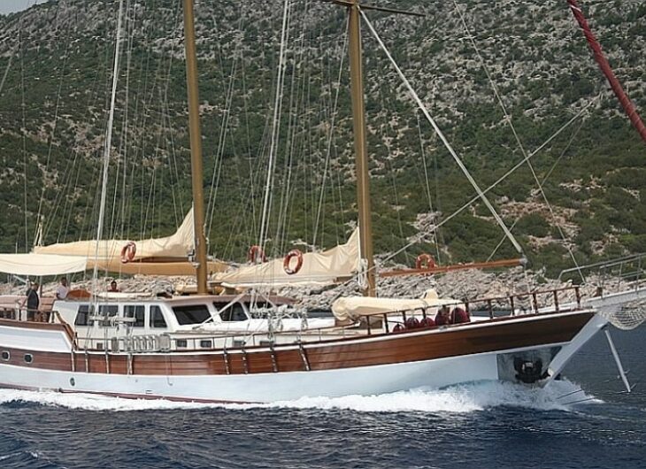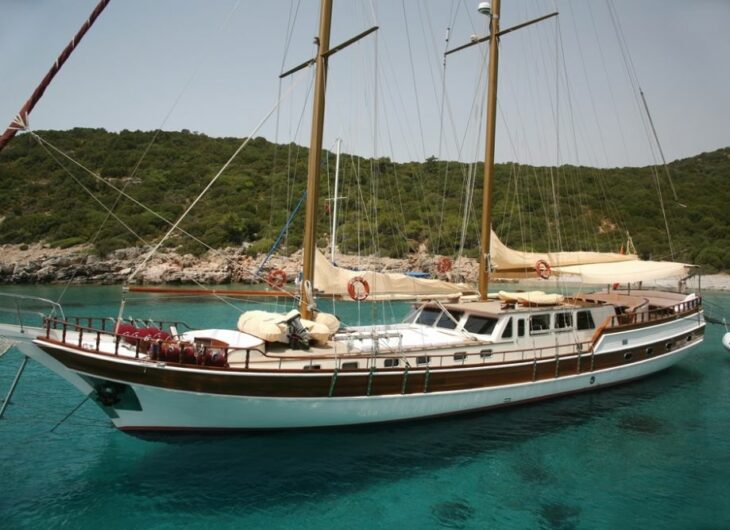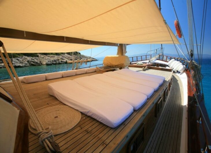 Sunbathing mattrasses, Outdoor dining table, Dining table in saloon, Separate crew cabin.