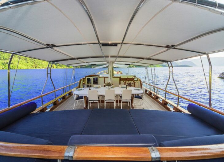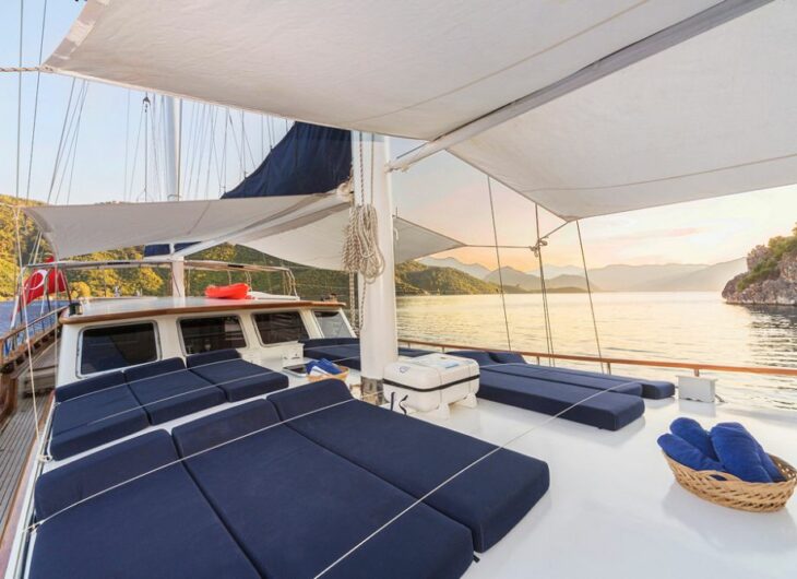 Sunbathing mattrasses, Outdoor dining table, Dining table in saloon, Separate crew cabin.