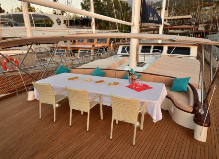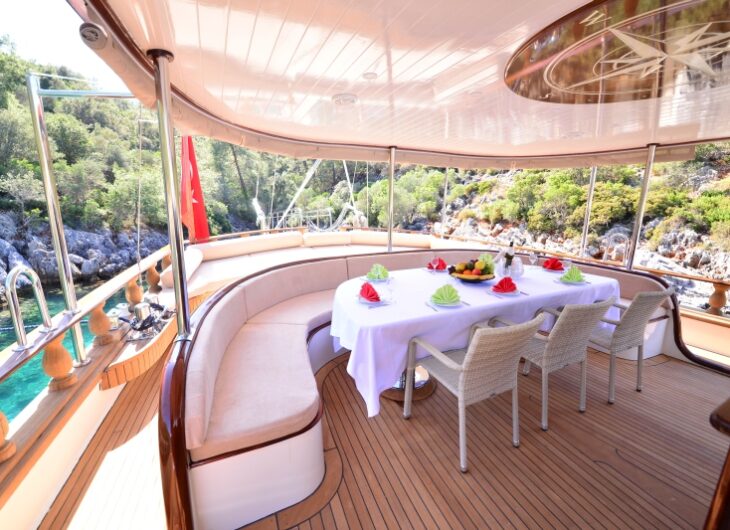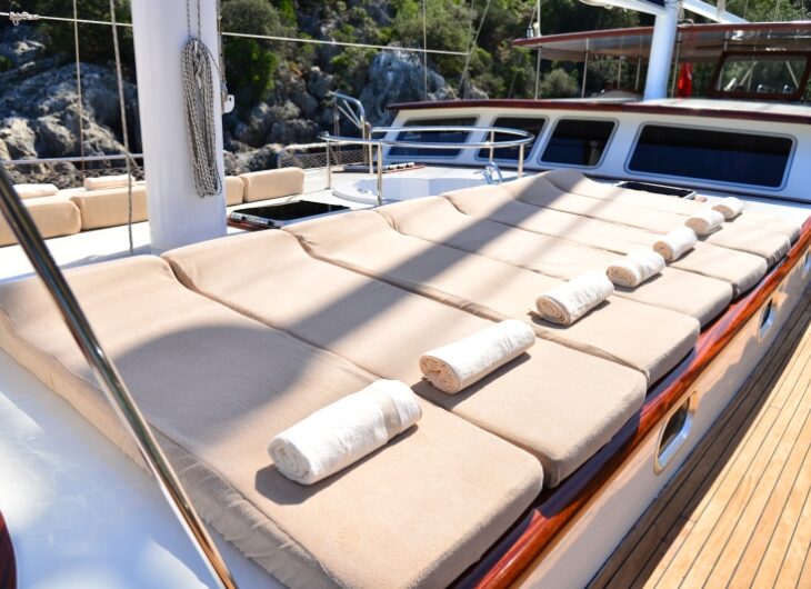 Sunbathing mattrasses, Front deck seating area, Outdoor dining table, Dining table in saloon, Music system in saloon, Separate crew cabin.