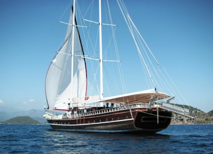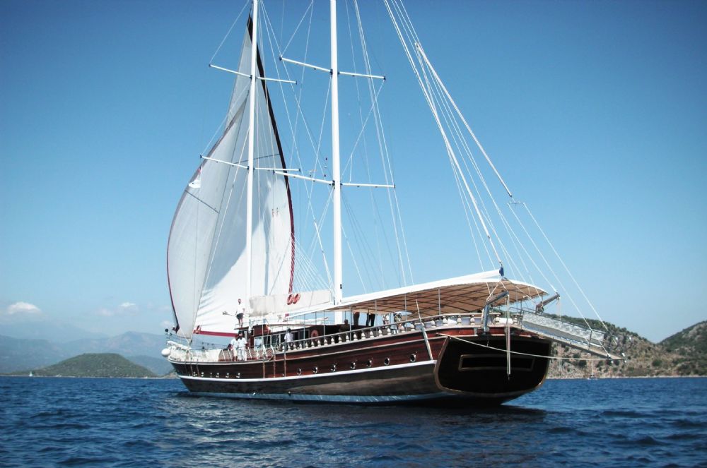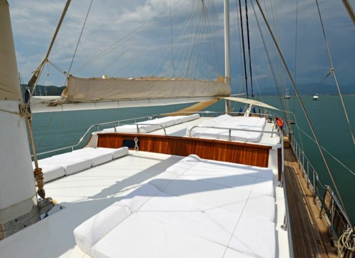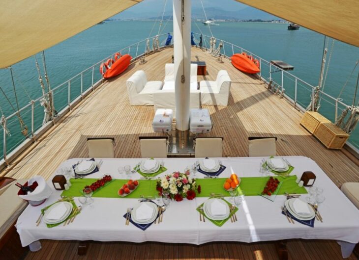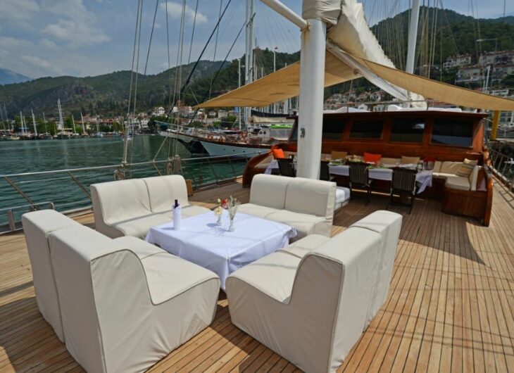 Sunbathing mattrasses, Outdoor dining table, Dining table in saloon, Music system in saloon, Separate crew cabin.