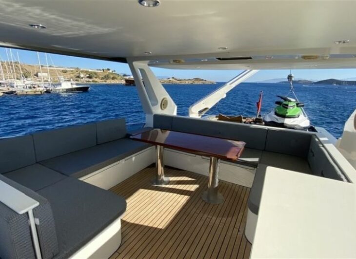 Flybridge, Sunbathing mattrasses, Outdoor dining table, Dining table in saloon.