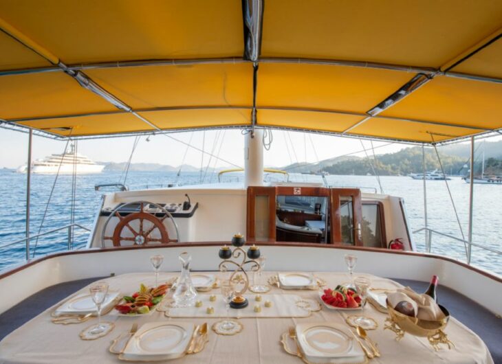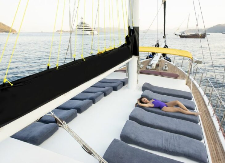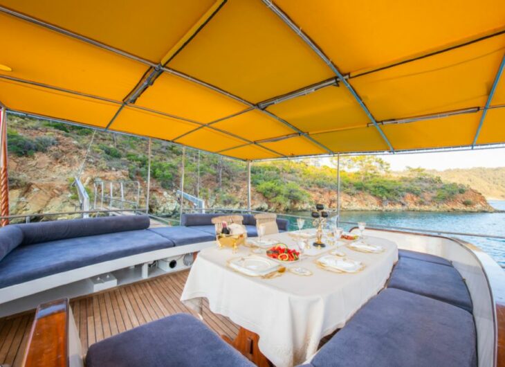 Sunbathing mattrasses, Front deck seating area, Outdoor dining table, Dining table in saloon, Music system in saloon.