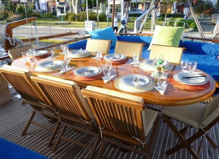 Sunbathing mattrasses, Outdoor dining table, Dining table in saloon, Music system in saloon.