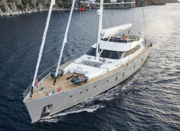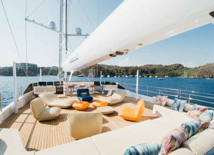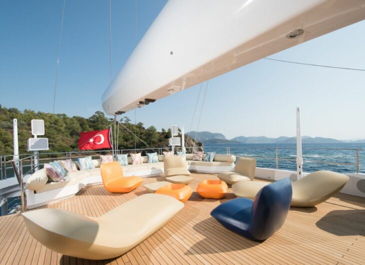 Upper deck sunbathing, LCD TV in cabins, Flybridge, Sunbathing mattrasses, Front deck seating area, Outdoor dining table, Dining table in saloon, Separate crew cabin.